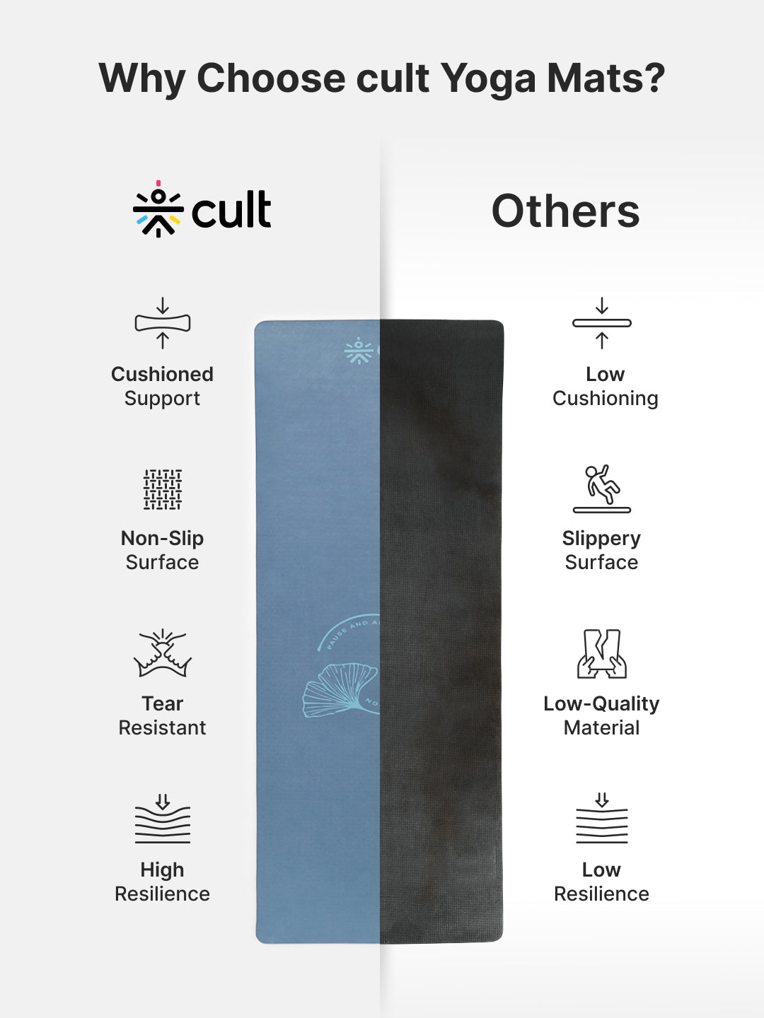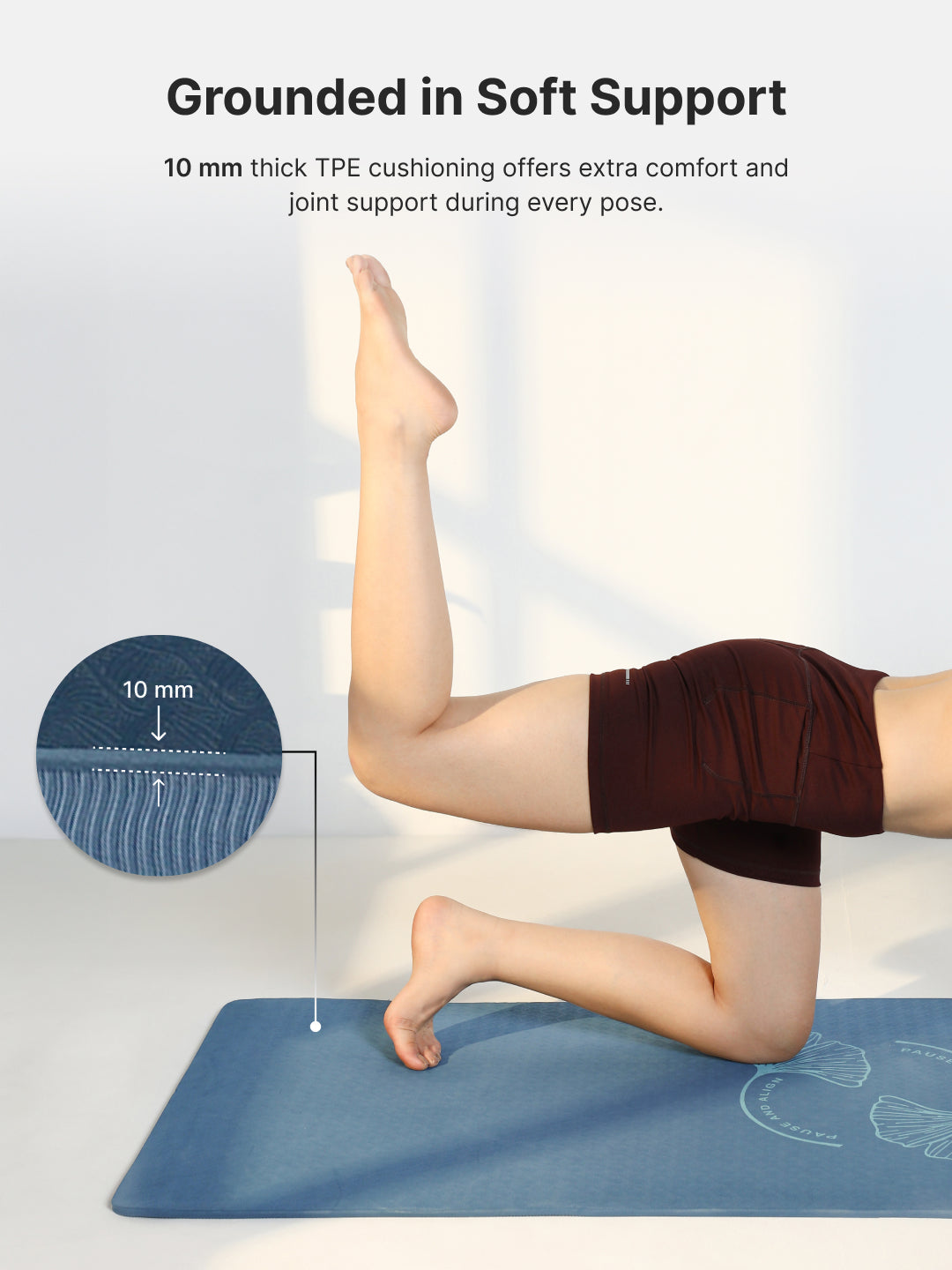 SKIN-FRIENDLY MATERIAL: Made from non-toxic, recyclable TPE and completely latex-free, it’s gentle on sensitive skin and a responsible choice for sustainable wellness. ANTI-SLIP GRIP FOR SUPPORT: The anti-skid base ensures the mat stays firmly in place on smooth floors, offering a safe and steady surface to practice even your most challenging poses. SUPERIOR CUSHIONING FOR JOINT SUPPORT: Crafted with 10 mm extra-thick TPE material, this mat offers plush comfort and reduces pressure on knees, elbows, and other joints—perfect for longer sessions and sensitive users. WITHSTANDS DAILY USE: Built to endure daily practice, the tear-resistant construction resists peeling, cracking, and wear—delivering long-term performance without compromise. LIGHTWEIGHT & TRAVEL-FRIENDLY: Designed for convenience, this mat is easy to carry with its included strap and fits neatly into a yoga bag—ideal for home or outdoor use.